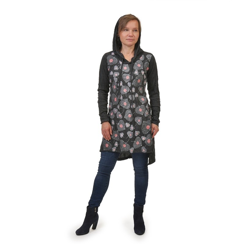 Pohodlná a praktická tunika značky Tulipánshop s kapucí a dlouhým rukávem ze 100% crash (mačkané) bavlny. Zadní díl je cca o 10 cm prodloužený a bez potisku.
