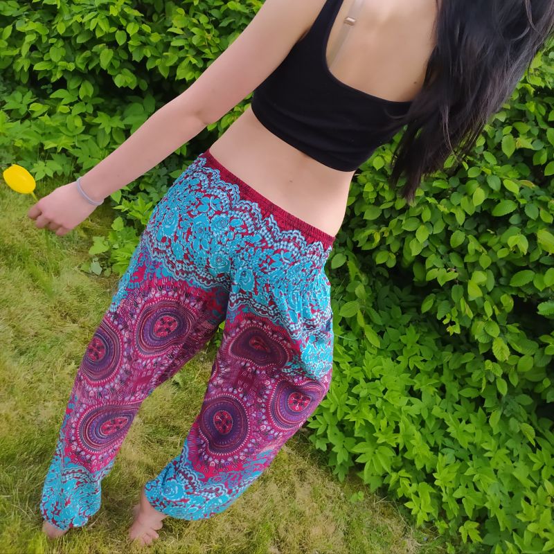 Tyto výjimečně pohodlné kalhoty ležérního střihu ladí k žabkám, teniskám i podpatku. Často jsou označované jako aladinky, afgány, haremky, nebo jednoduše turecké kalhoty. Jsou nepostradatelnou součástí šatníku milovnic léta, nezávislého cestování, boho stylu a dobré pohody. Kapsy na bocích. Univerzální velikost, délka cca 102 cm, elasticita žabky v pase cca 30 - 50cm. Materiál kvalitní 100% viskóza (někdy též označovaná jako průmyslové hedvábí, nebo rayon).
