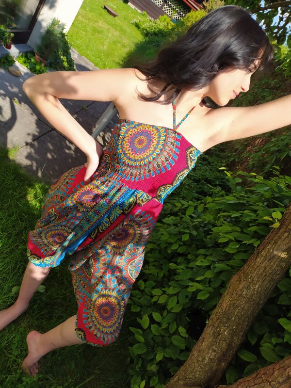 Výjimečně pohodlné kalhoty 2 v 1, lze nosit i jako šaty - overal s žabkou přes prsa, úvazem za krk a podkasanou nohavičkou připomínající balonovou sukni. Ležérní střih s mostovým, sníženým rozkrokem ladí k žabkám, teniskám i podpatku. Často označované jako aladinky, afgány, haremky, nebo jednoduše turecké kalhoty, jsou nepostradatelnou součástí šatníku milovnic léta, nezávislého cestování, boho stylu a dobré pohody. Univerzální velikost, délka 102 cm, elasticita žabky v pase cca 30 -50 cm. Materiál kvalitní 100% viskóza (někdy též označovaná jako průmyslové hedvábí, nebo rayon).