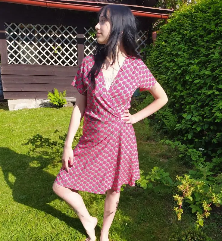 Jednoduché zavinovací šaty Tulipánshop s krátkým rukávkem, výstřihem do véčka, předním křížením a úzkou boční vazačkou. Krásný vzor s motivem letících jeřábů.