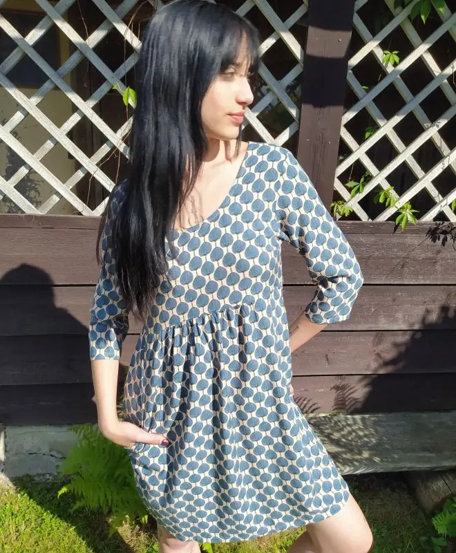 Pohodlné šatečky Tulipánshop s tříčtvrtečním rukávkem. Kulatý výstřih, malé záložky v přestřižení a navazující hluboké kapsy na bocích. 100% viskóza s krásným jemným vzorem japonských vějířů.