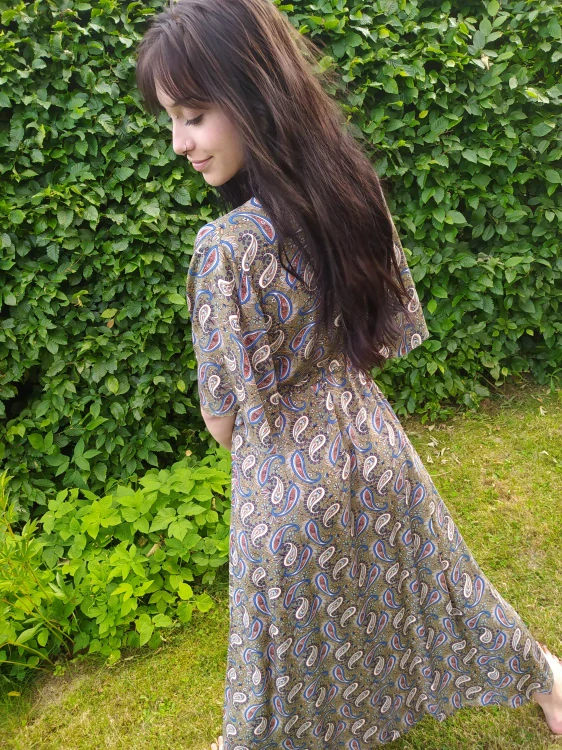 Pohodlné zavinovací šaty Tulipánshop. Všitý pásek s průvlekem. Délka 133 cm, šířka pod průramky cca 44 cm (přední díl). Rozšiřující se rukávek. Univerzální velikost. M - L.
