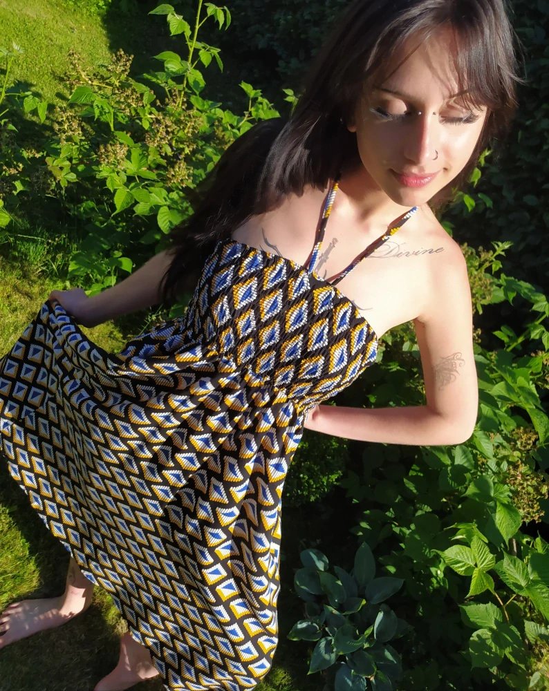 Pohodlné a praktické letní šaty/sukně Tulipánshop. Dva v jednom. 17 cm široká žabka s tunýlkem a šňůrkou ukončenou kovovými uzlíky. Elasticita žabky v extrémech 32 - 55 cm ( měřen přední díl). Délka 98 cm. Univerzální velikost pokrývající M a L.