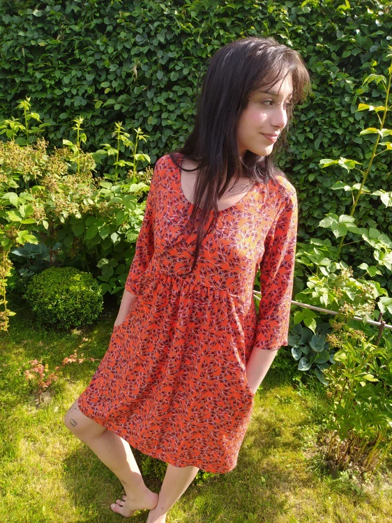 Pohodlné šatečky Tulipánshop s tříčtvrtečním rukávkem. Kulatý výstřih, malé záložky v přestřižení a navazující hluboké kapsy na bocích.