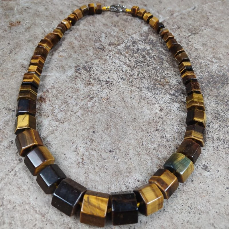 Náhrdelník z broušeného tygřího kamene. Délka 44 cm, kovové zapínání. Největší komponent cca 17 x 15 mm.