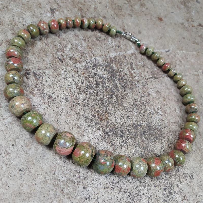Náhrdelník z minerálu unakit. Délka 44 cm, kovové zapínání. Největší komponent cca 17 mm v průměru. Charakteristické jemné zbarvení unakitu na okolí působí harmonickým dojmem.