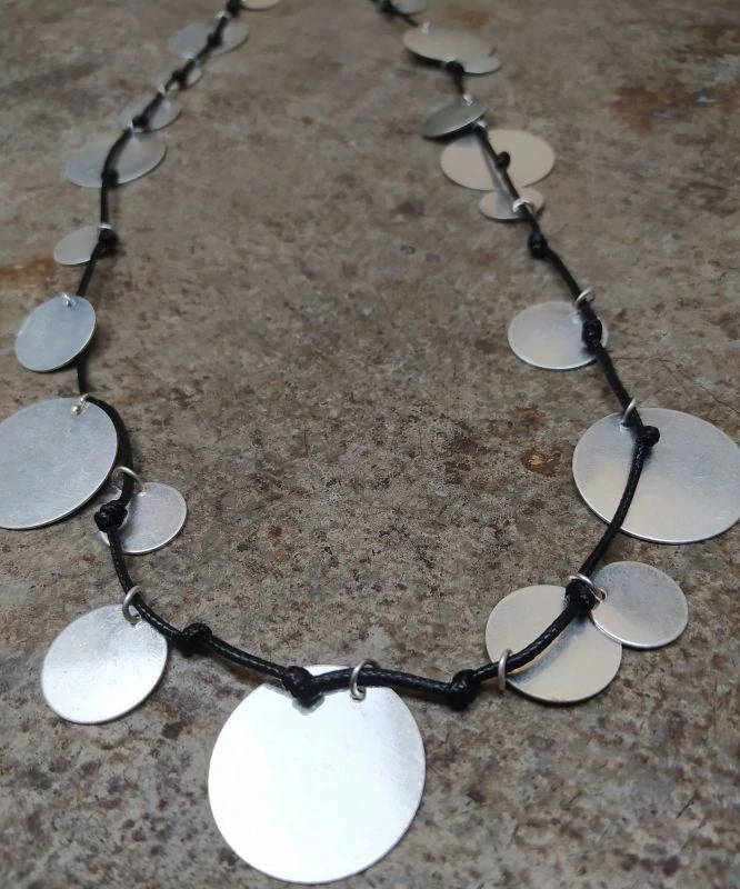 Elegantní náhrdelník, bavlna, bižuterní kov. Délka cca 90 cm, průměr největšího přívěšku cca 3 cm. Pohodlné zapínání s prodlužovacím řetízkem. Ke slavnostní příležitosti i běžnému nošení.