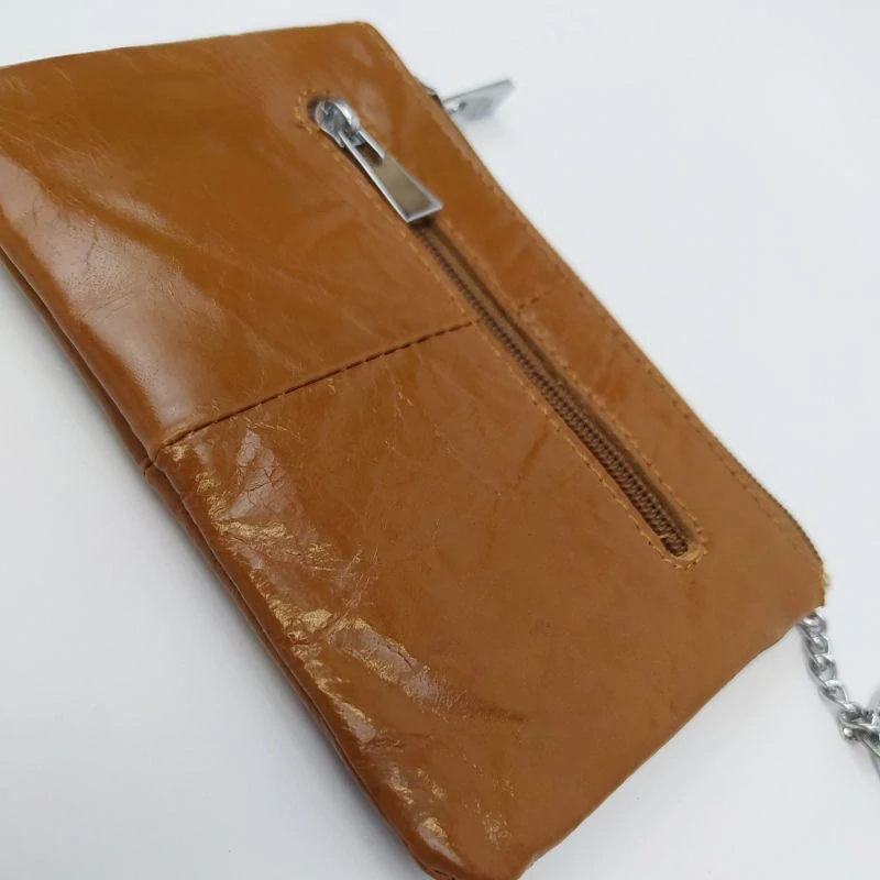 Kvalitní kožená peněženka hnědé barvy. Na bocích opatřena zipem uzavíratelnou kapsou na drobné a dvěma přihrádkami velikosti platební karty. V hlavní kapse řetízek s očkem na klíče. Velikost 13 x 8,5 .