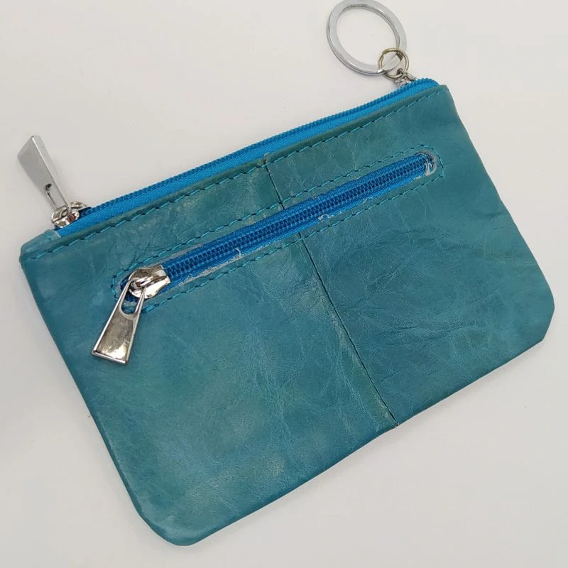 Kvalitní kožená peněženka tyrkysové barvy. Na bocích opatřena zipem uzavíratelnou kapsou na drobné a dvěma přihrádkami velikosti platební karty. V hlavní kapse řetízek s očkem na klíče. Velikost 13 x 8,5 .