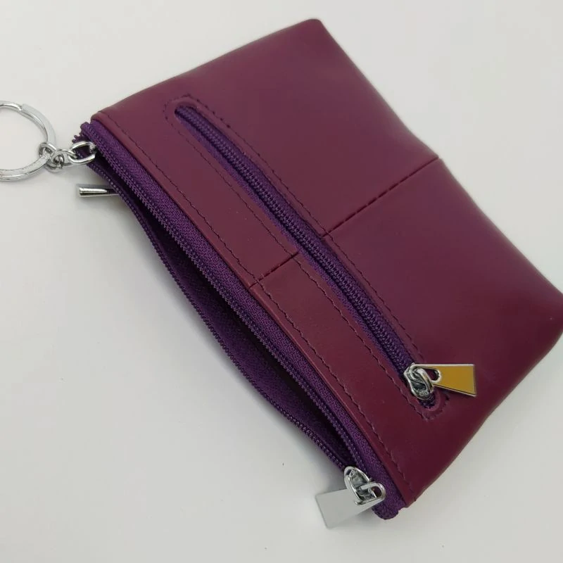 Vínová kožená peněženka se třemi vnějšími a jednou vnitřní na zip uzavíratelnou kapsou. Elegentní a praktický model s řetízkem s kroužkem na klíče v hlavní přihrádce. Velikost 13 x 9 cm.