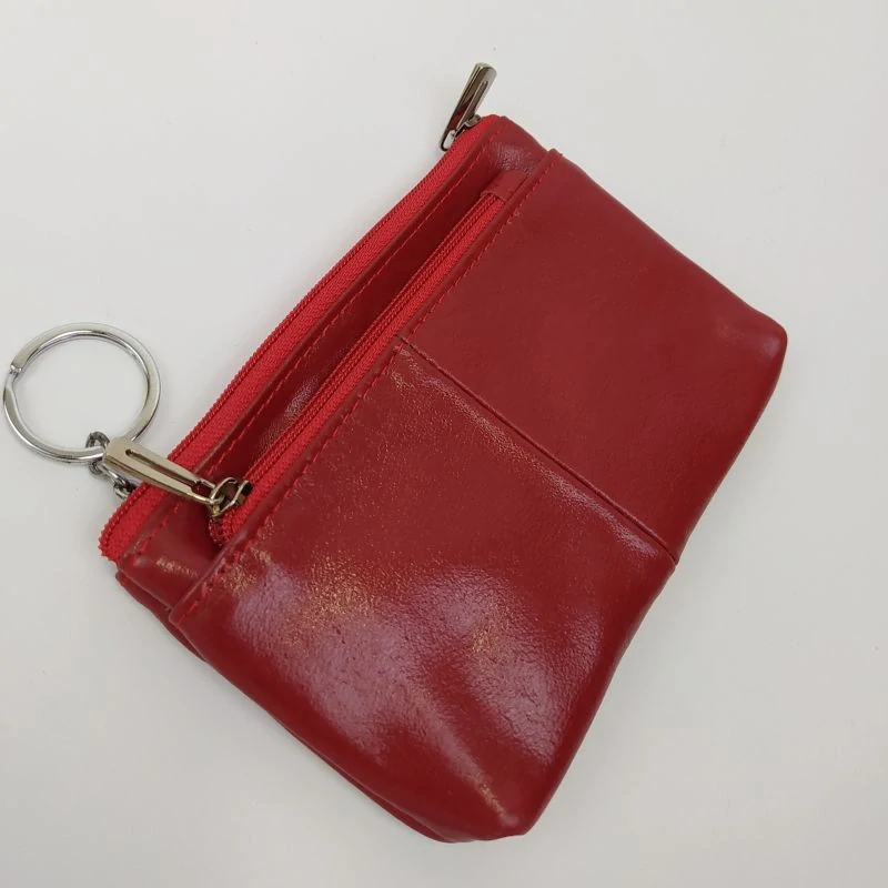 Červená kožená peněženka se třemi vnějšími a jednou vnitřní na zip uzavíratelnou kapsou. Elegentní a praktický model s řetízkem s kroužkem na klíče v hlavní přihrádce. Velikost 13 x 9 cm.