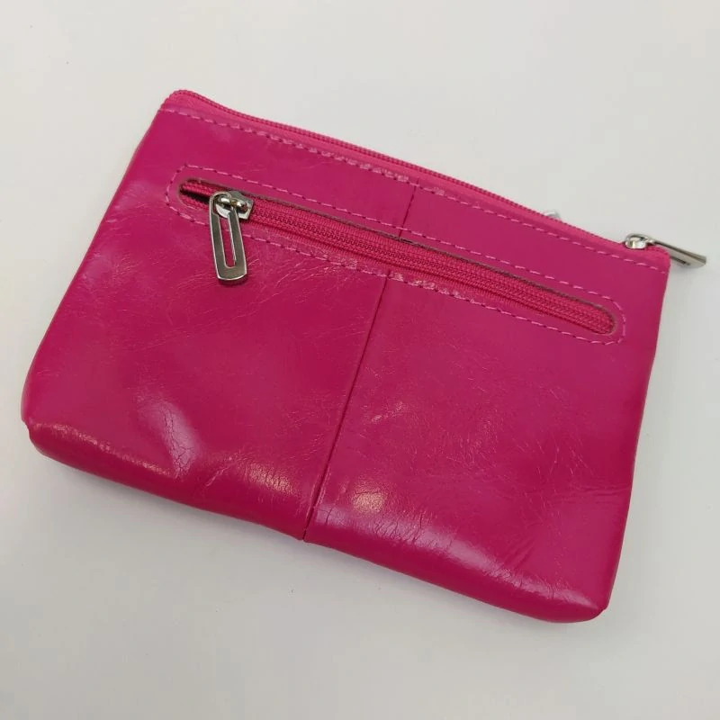 Růžová kožená peněženka se třemi vnějšími a jednou vnitřní na zip uzavíratelnou kapsou. Elegentní a praktický model s řetízkem s kroužkem na klíče v hlavní přihrádce. Velikost 13 x 9 cm.