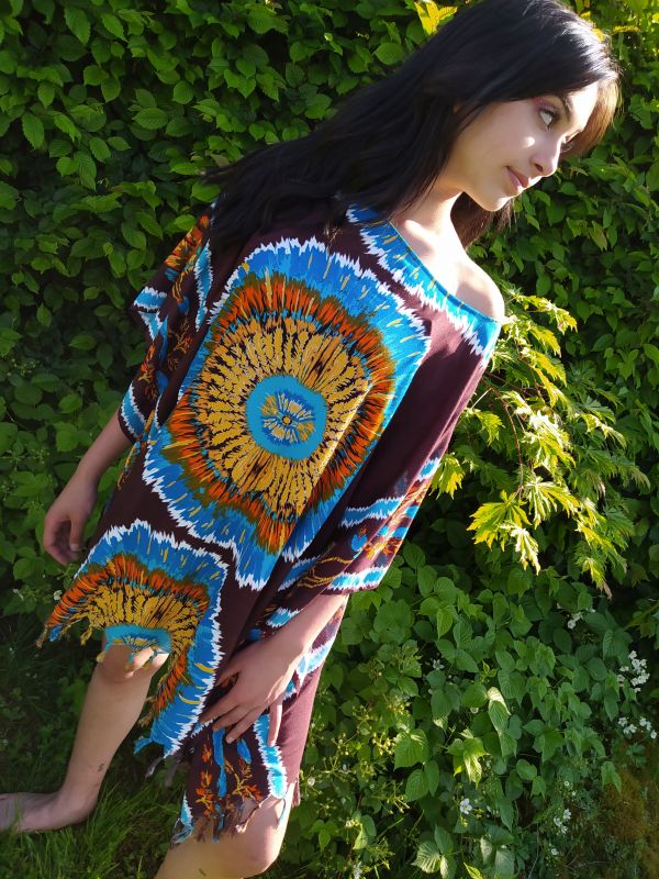 Lehounké pončo - halenka s nádherným vzorem oceníte především v horkých letních dnech. Univerzální velikost, 100% viskóza (někdy označovaná jako průmyslové hedvábí, nebo též rayon), báječný poměr cena - komfort - kvalita. Tenhle kousek osvěží každý letní šatník. Jako vzdušné šatečky na plavky, volná halenka k riflím i pohodlné domácí oblečení. Vhodné i jako halenka nadměrné velikosti.