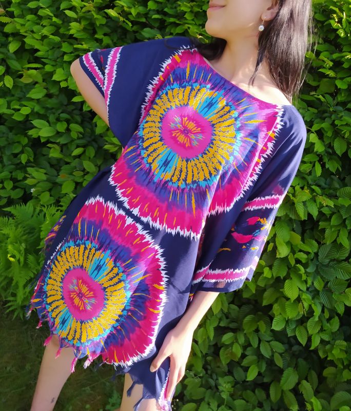 Lehounké pončo - halenka s nádherným vzorem oceníte především v horkých letních dnech. Univerzální velikost, 100% viskóza (někdy označovaná jako průmyslové hedvábí, nebo též rayon), báječný poměr cena - komfort - kvalita. Tenhle kousek osvěží každý letní šatník. Jako vzdušné šatečky na plavky, volná halenka k riflím i pohodlné domácí oblečení. Vhodné i jako halenka nadměrné velikosti.