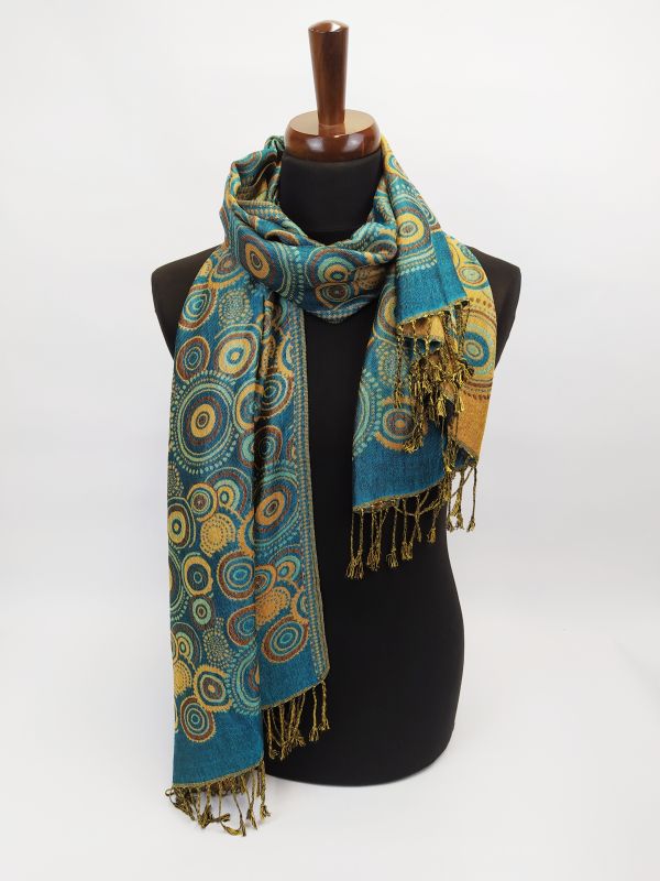 Velká šála pašmínového typu s atraktivním vzorem. Příjemná na dotek, materiál 60% bavlna, 40% viskóza. Velikost 185 x 70 cm.