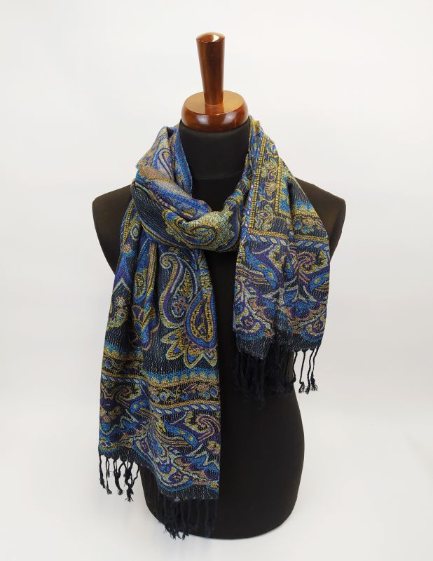 Velká šála pašmínového typu s atraktivním kašmírovým vzorem. Příjemná na dotek, materiál 50% bavlna, 50% viskóza. Velikost 185 x 70 cm.