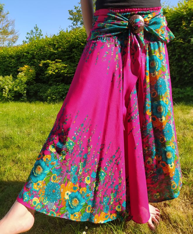 Kolová letní sukně s řaseným páskem s kokosovou sponou na předním dílu. 2 v 1, lze nosit i jako šaty s cípy zavázanými za krk. Délka 102 cm. Šířka elastické žabky v pase (bocích/přes prsa) 26 až 53 cm. 100% viskóza (též označovaná jako rayon). Lehounká a pohodlná.