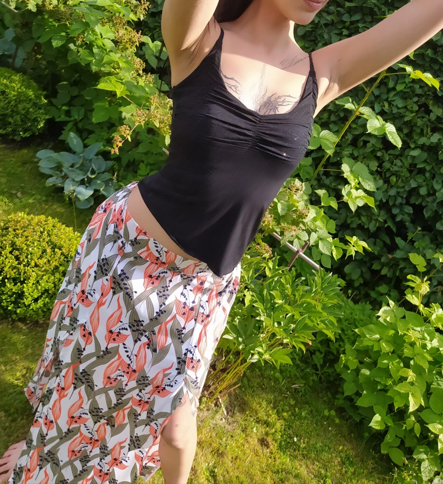 Krásná letní sukně s motivem konvalinek. Všitý pásek s drobným kovovým detailem ve tvaru pírka a gumičkou v zadním dílu má elasticitu 33 - 44 cm (měřen přední díl). Asi do dvou třetin předního dílu sahají dva paralelní rozparky. Téměř až k rozparku sahá lehounká všitá spodnička. Délka 99 cm. Velikost S - M.