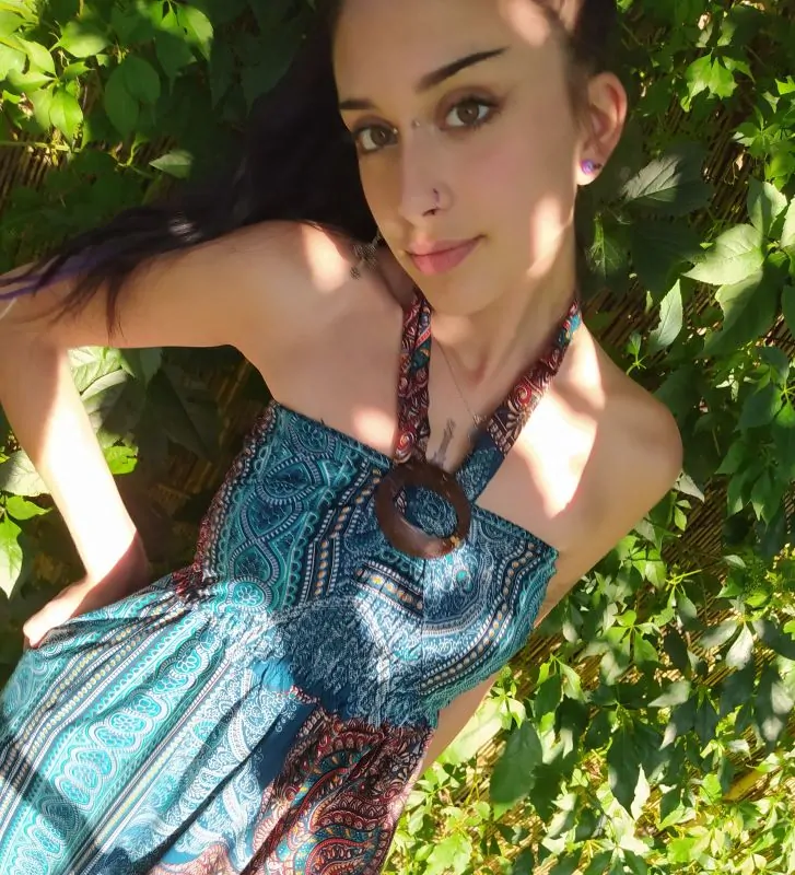 Kolová letní sukně s řaseným páskem s kokosovou sponou na předním dílu. 2 v 1, lze nosit i jako šaty s cípy zavázanými za krk. Délka 102 cm. Šířka elastické žabky v pase (bocích/přes prsa) 26 až 53 cm. 100% viskóza (též označovaná jako rayon). Lehounká a pohodlná.