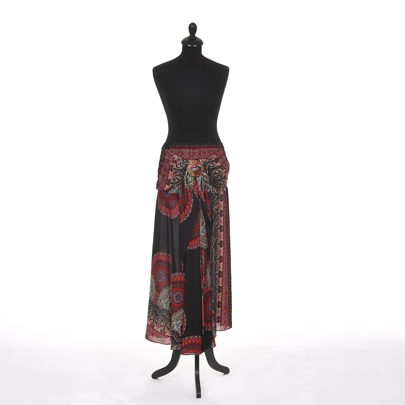 Kolová letní sukně s řaseným páskem s kokosovou sponou na předním dílu. 2 v 1, lze nosit i jako šaty s cípy zavázanými za krk. Délka 102 cm. Šířka elastické žabky v pase (bocích/přes prsa) 26 až 53 cm. 100% viskóza (též označovaná jako rayon). Lehounká a pohodlná.