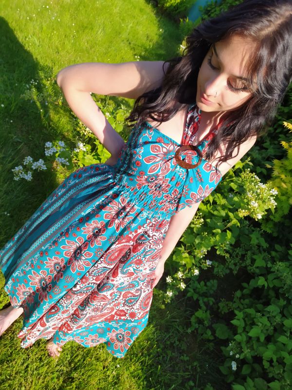 Kolová letní sukně s řaseným páskem s kokosovou sponou na předním dílu. 2 v 1, lze nosit i jako šaty s cípy zavázanými za krk. Délka 102 cm. Šířka elastické žabky v pase (bocích/přes prsa) 26 až 53 cm. 100% viskóza (též označovaná jako rayon). Lehounká a pohodlná.