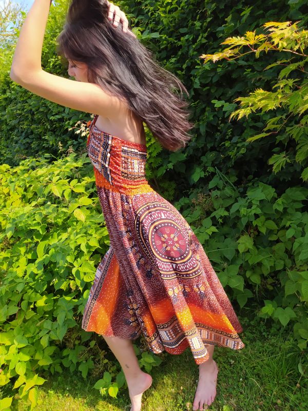 Kolová letní sukně s řaseným páskem s kokosovou sponou na předním dílu. 2 v 1, lze nosit i jako šaty s cípy zavázanými za krk. Délka 102 cm. Šířka elastické žabky v pase (bocích/přes prsa) 26 až 53 cm. 100% viskóza (též označovaná jako rayon). Lehounká a pohodlná.