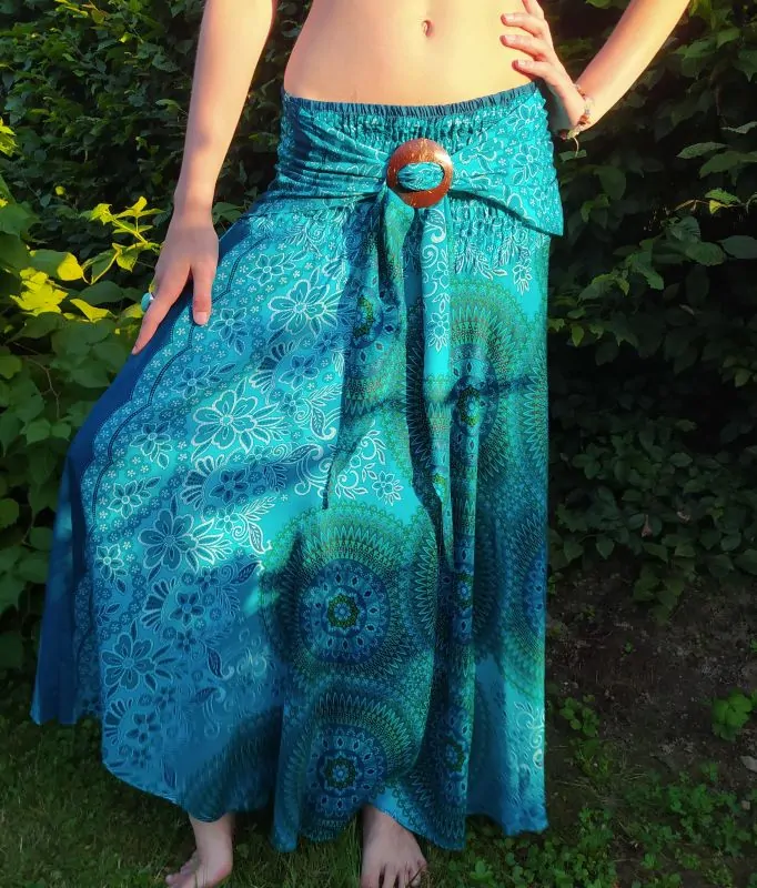 Kolová letní sukně s řaseným páskem s kokosovou sponou na předním dílu. 2 v 1, lze nosit i jako šaty s cípy zavázanými za krk. Délka 102 cm. Šířka elastické žabky v pase (bocích/přes prsa) 26 až 53 cm. 100% viskóza (též označovaná jako rayon). Lehounká a pohodlná.