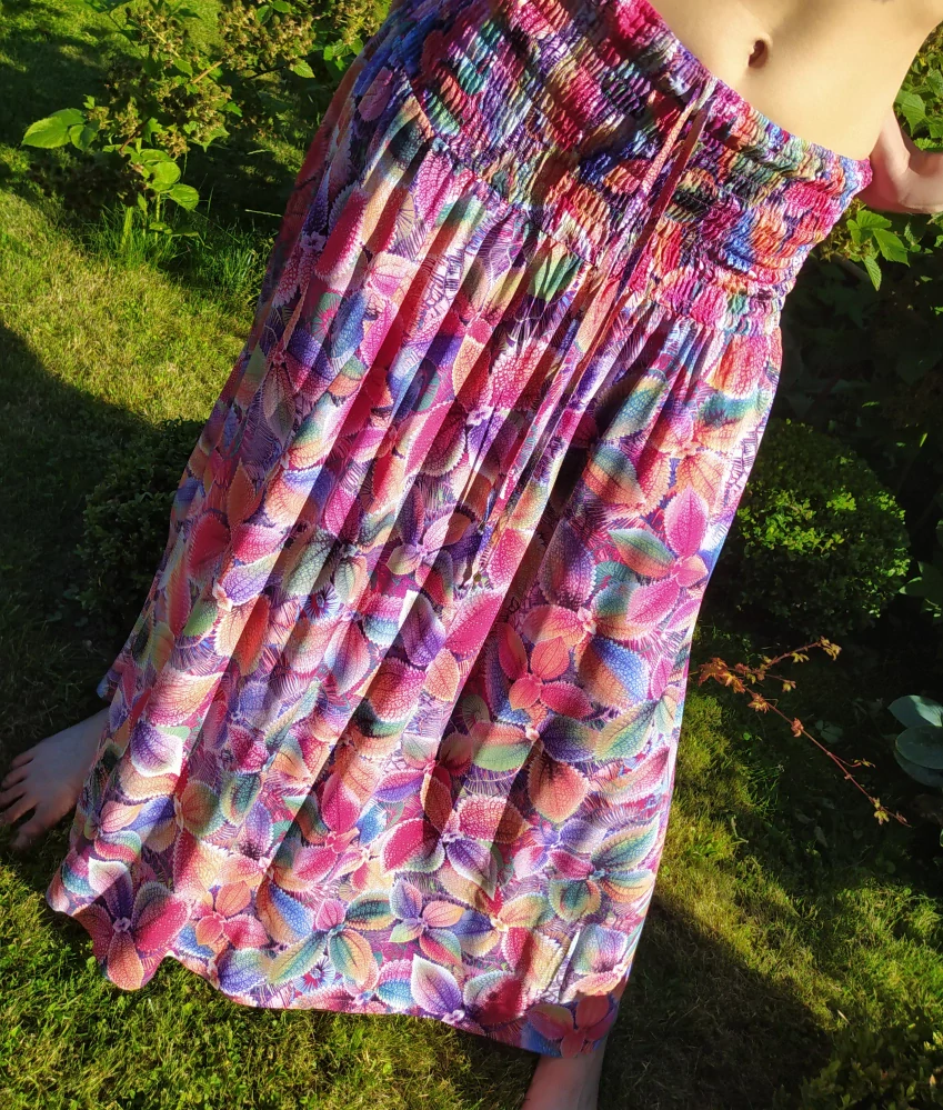 Pohodlná a praktická letní sukně/šaty Tulipánshop. Dva v jednom. 17 cm široká žabka s tunýlkem a šňůrkou ukončenou kovovými uzlíky. Elasticita žabky v extrémech 32 - 55 cm ( měřen přední díl). Délka 98 cm. Univerzální velikost pokrývající M a L.