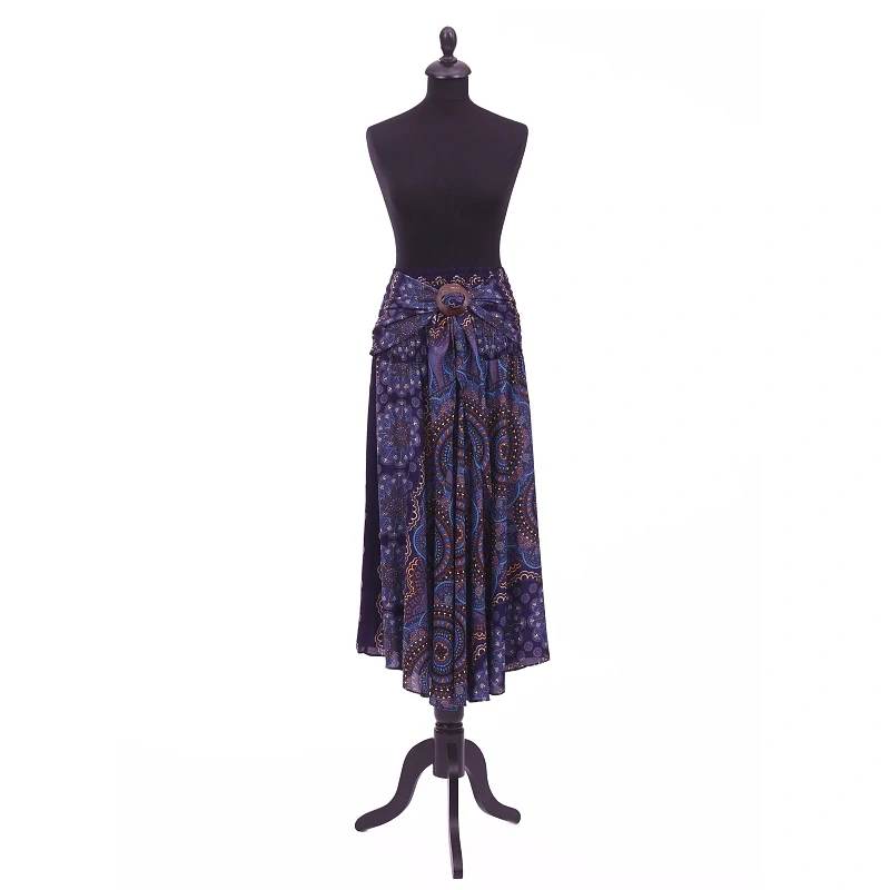 Kolová letní sukně s řaseným páskem s kokosovou sponou na předním dílu. 2 v 1, lze nosit i jako šaty s cípy zavázanými za krk. Délka 102 cm. Šířka elastické žabky v pase (bocích/přes prsa) 26 až 53 cm. 100% viskóza (též označovaná jako rayon). Lehounká a pohodlná.