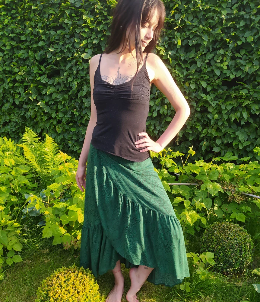 Vzdušná, ležérní, zavinovací sukně/šaty Tulipánshop. Dva v jednom. Rozšiřující se kanýr po celé délce vytváří krásný detail. Dvě poutka s krytím a úzkým páskem. Šířka bez pásku 92 cm. Délka cca 98 cm. Univerzální velikost pokrývá bez problémů S až L. Ideální šaty k moři!