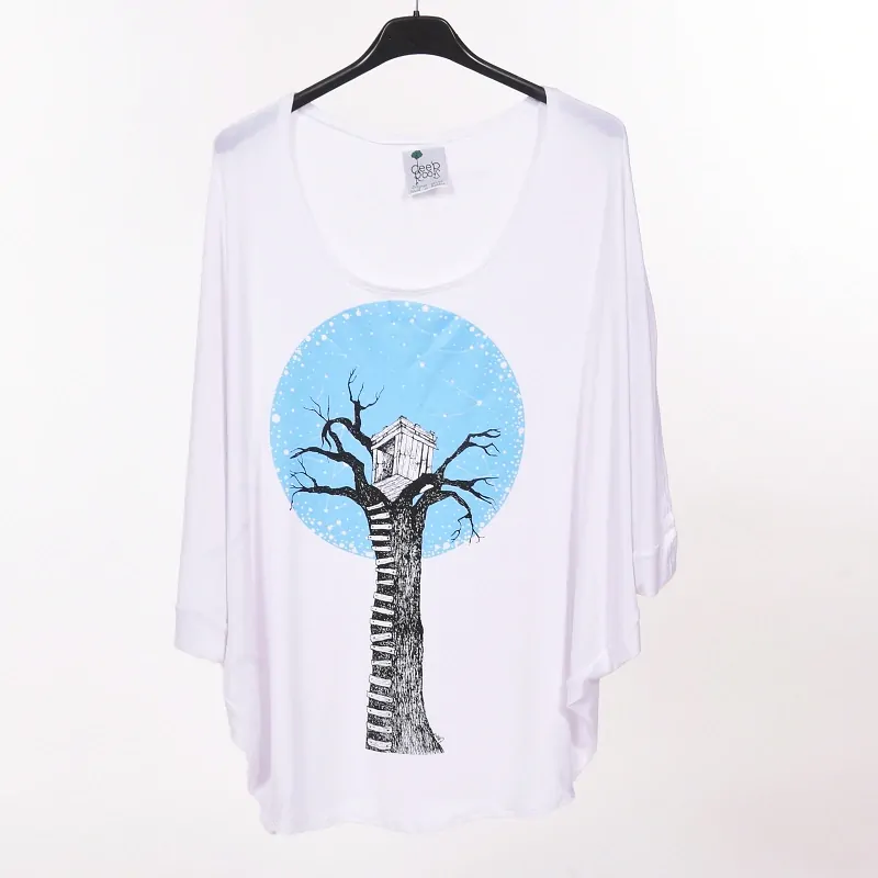 Halenka které pracovně říkáme netopýr, kvůli jejímu střihu připomínajícímu malé kimono, osvěží váš šatník svojí originalitou a pohodlím. Původní grafika od návrhářky EL a mikrosériová výroba je zárukou výjimečnosti. Délka 60 cm, šířka v nejširším bodě 100 cm.